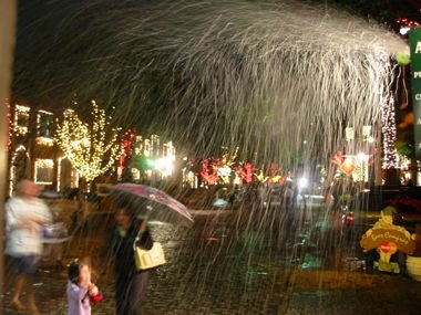 Esta foto foi tirada na Rua Normandia, em São Paulo, famosa pela chuva artificial de neve que ocorre no Natal. Observe que não é possível identificar os "flocos" de neve: aparecem como riscos, criando um efeito bastante interessante. Como foi efetuado este registro?  Forçamos, manualmente, uma velocidade muito baixa (1/8s) e uma abertura muito grande (f2.8), devido à pouca luminosidade do ambiente. Ao clicar, o diafragma ficou aberto por um período bastante longo, permitindo registrar a trajetória de cada floco de neve, que deixou um risco na foto. O que você observa é o  conjunto de riscos de todos os flocos nesse momento. Observe a pessoa à esquerda: está tremida. Como estava caminhando, a câmera (o CCD) registrou o percurso percorrido pelo sujeito (da mesma forma que os flocos de neve) resultando em um registro sem definição (que adiciona um detalhes à mais ao conjunto). Observe, também, o boneco no canto inferior direito: aparece nítido, devido a ser estático.